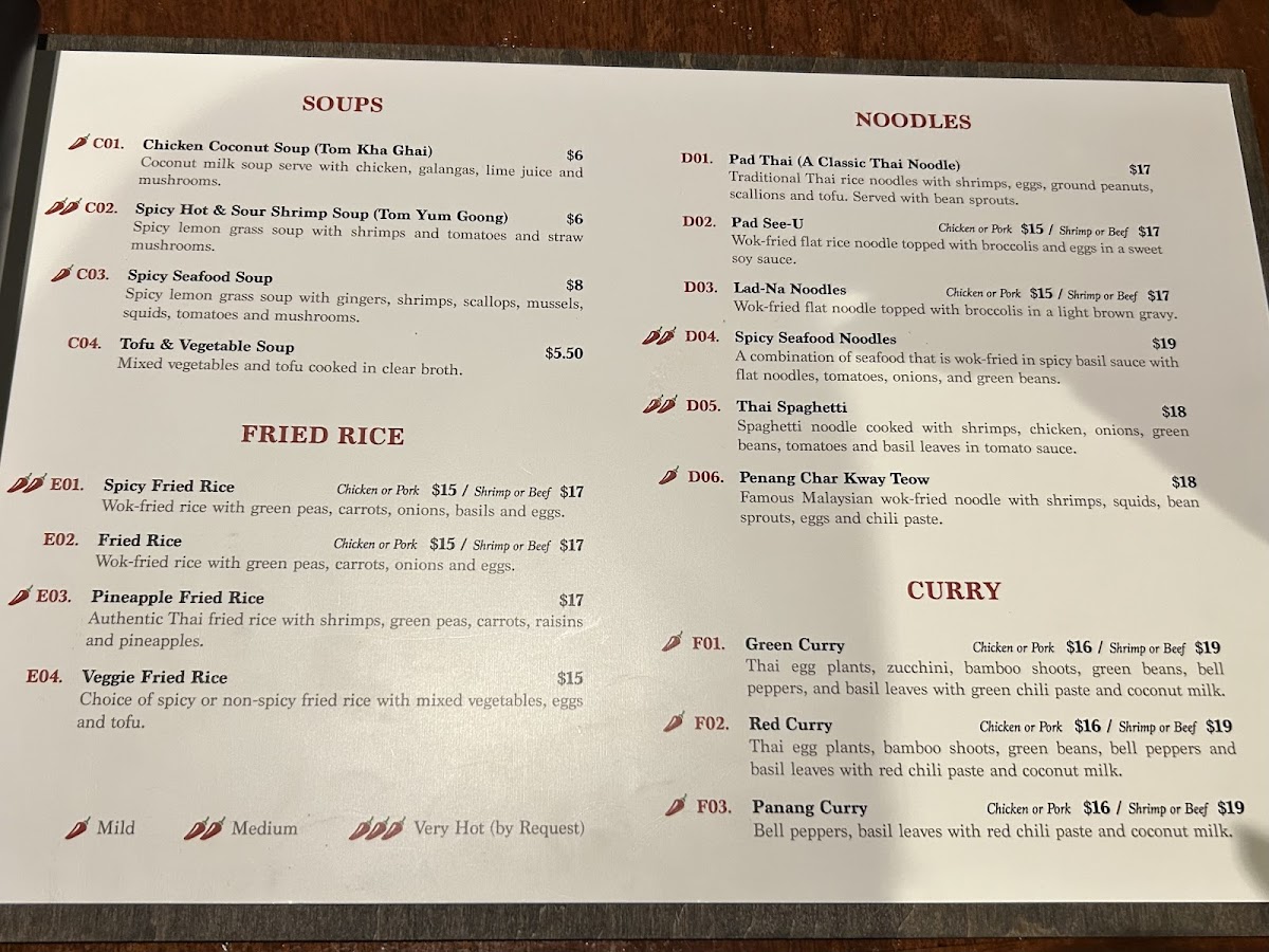 “ It is one of the best places to get Coconut Soup. My family and I went to get lunch since they did a lunch special till 3 pm. You get to order a dish that comes with Coconut Soup and white rice. We ordered Pad See U, Pad Thai, and the Spicy Fried Rice. With beef or shrimp, it is an additional $2. The items were a bit sweet for us and it could be spicier but it was all good. Our server was amazing. She was pretty fast at bringing our food to the table. Great experience overall! ”